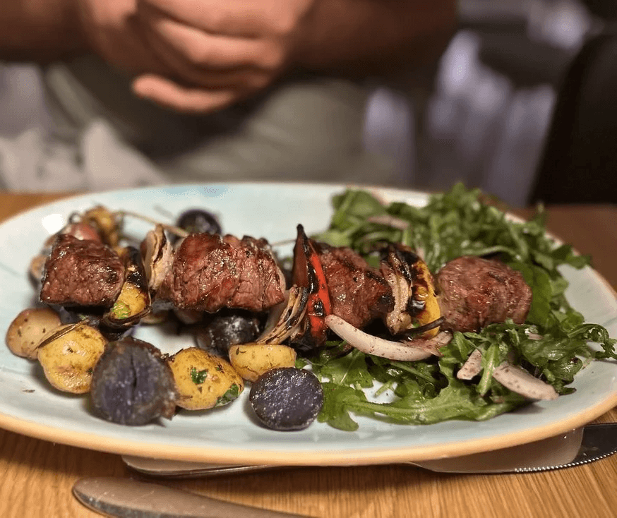 Saffron Chicken Kabob: Perfectly tender, incredibly juicy, and grilled just right! They’re paired with fluffy basmati rice and a fresh arugula salad that balances the richness beautifully.